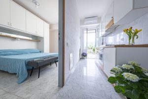Appartamento situato al pian terreno di 29 mq composto da luminosa camera matrimoniale, piccola cucina, bagno con box doccia. Ampia loggia attrezzata per mangiare all’esterno.