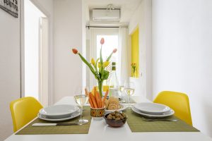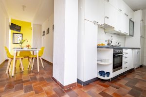 Appartamento situato al pian terreno di 37 mq composto da un’ampia camera tripla con letto matrimoniale e letto singolo, sala da pranzo e cucina con forno e lavastoviglie, bagno con box doccia. Spazio esterno privato attrezzato e giardino.